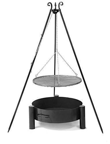 Das stabile 3-Bein des Schwenkgrills besteht aus Stahl, ist ca: 185 cm hoch und auch auf unebenem Untergrund einsetzbar. Mittels einer Umlenkrolle und einer Kette ist der Edelstahl-Grillrost in der Höhe verstellbar. Ob Lagerfeuer oder Feuerschale, das Grillgut hat dadurch immer die optimale Hitze.