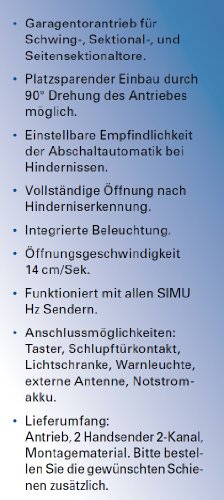 Der Simu GM800 Garagentorantrieb „Made in Europa“, ein Antrieb der universell und überzeugend ist. Er bewegt mit seinen maximal 800Nm Garagentore mit einer Fläche von 10m². In seinem Lieferumfang befinden sich neben zwei Simu Hz Mini-Handfunksender auch eine Bedienungsanleitung und Montagematerial. Der GM800 ist kompapibel mit allen Funksendern aus der Simu Hz Serie (433,42MHz). Diese ist bekannt und besonders sicher durch über 16 Millionen Kombinationen „Rolling Code“. Öffnen und schließen Sie bequehm Ihr Schwing-, Sektional- oder Seitensektionaltor. Ein platzsparender Einbau ist durch eine 90° Drehung des Antriebs möglich und die Hinderniserkennung schützt Personen und Gegenstände vor Schaden. 14cm/Sek und eine integrierte Beleuchtung sichern ein zügiges Öffnen und Schließen zu, ohne Sie dabei im Dunkeln stehen zu lassen. Mit Anschlussmöglichkeiten wie Taster, Schlupftürkontakt, Lichtschranke, Warnleuchte, externe Antenne und Notstromakku lässt sich der GM800 auch noch modular erweitern. Bitte wählen Sie nach dem Kauf noch eine gewünschte Schiene zu Ihrem GM800, denn diese ist nicht im Lieferumfang und wird dringend benötigt.